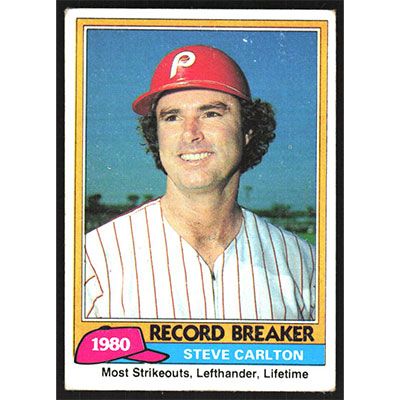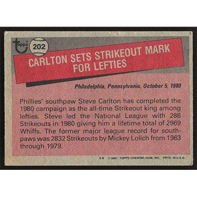 This is a 1981 Topps Steve Carlton Record Breaker baseball card. The card is #202 and pictures show condition.