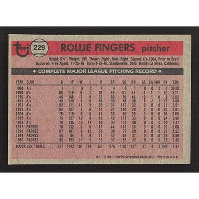 This is a 1981 Topps Rollie Fingers baseball card. The card is #229 and pictures show condition.