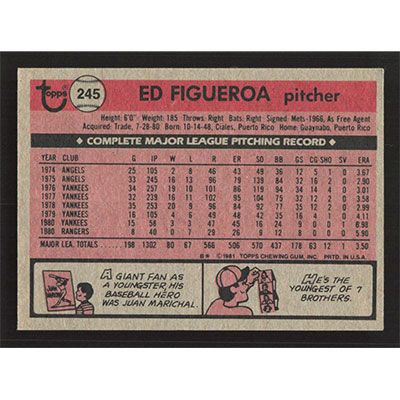 This is a 1981 Topps Ed Figueroa baseball card. The card is #245 and pictures show condition.
