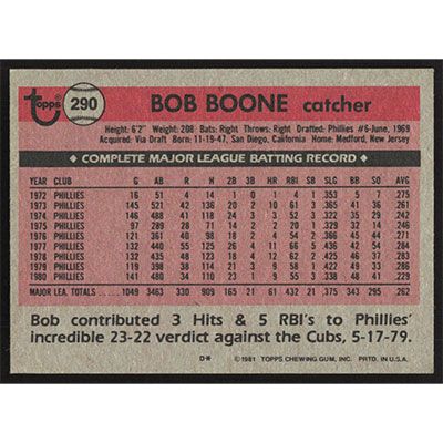 This is a 1981 Topps Bob Boone baseball card. The card is #290 and pictures show condition.