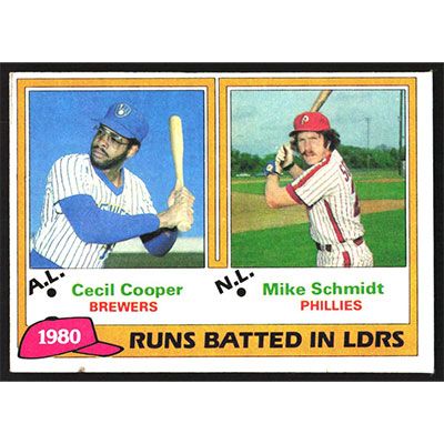 This is a 1981 Topps Cecil Cooper and Mike Schmidt League Leaders baseball card. The card is #3 and pictures show condition. Team(s): Milwaukee Brewers/Philadelphia Phillies