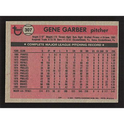 This is a 1981 Topps Gene Garber autographed baseball card. This card has been signed, in blue, by Gene Garber, and is guaranteed authentic by Ballcardz.com. The card is #307 and pictures show condition.