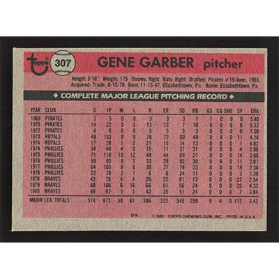 This is a 1981 Topps Gene Garber baseball card. The card is #307 and pictures show condition.