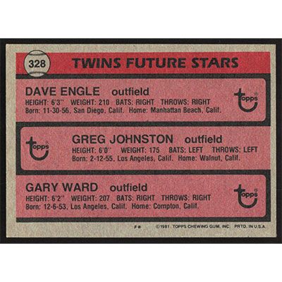 This is a 1981 Topps Dave Engle, Greg Johnston and Gary Ward Future Stars baseball card. The card is #328 and pictures show condition. Team(s): Minnesota Twins Rookie Card (RC)