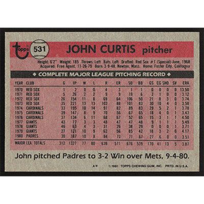 This is a 1981 Topps John Curtis baseball card. The card is #531 and pictures show condition.