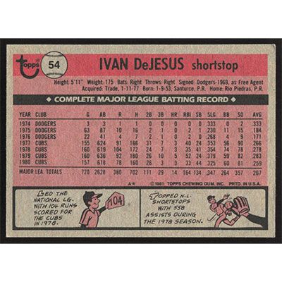 This is a 1981 Topps Ivan DeJesus baseball card. The card is #54 and pictures show condition.