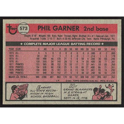 This is a 1981 Topps Phil Garner baseball card. The card is #573 and pictures show condition.