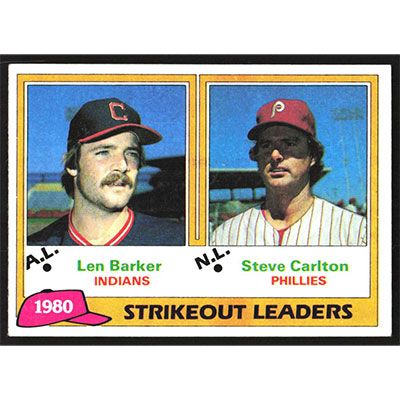 This is a 1981 Topps Len Barker and Steve Carlton Strikeout Leaders baseball card. The card is #6 and pictures show condition. Team(s): Cleveland Indians/Philadelphia Phillies