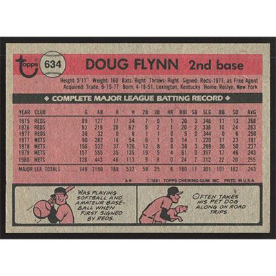 This is a 1981 Topps Doug Flynn baseball card. The card is #634 and pictures show condition.