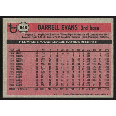 This is a 1981 Topps Darrell Evans baseball card. The card is #648 and pictures show condition.