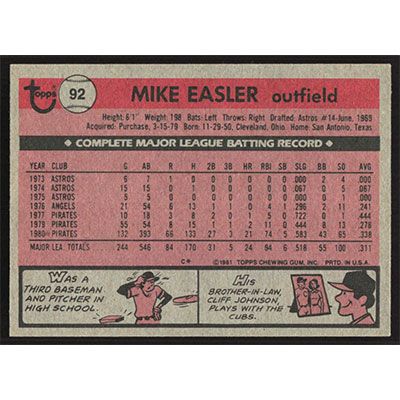 This is a 1981 Topps Mike Easler autographed baseball card. This card has been signed, in blue, by Mike Easler, and is guaranteed authentic by Ballcardz.com. The card is #92 and pictures show condition.