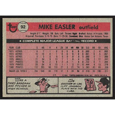 This is a 1981 Topps Mike Easler baseball card. The card is #92 and pictures show condition.