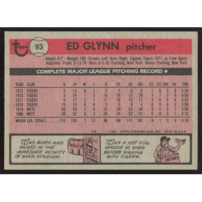 This is a 1981 Topps Ed Glynn baseball card. The card is #93 and pictures show condition.