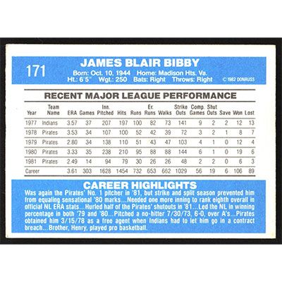 This is a 1982 Donruss Jim Bibby baseball card. The card is #171 and pictures show condition.