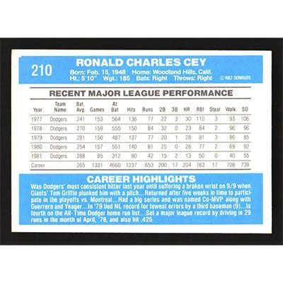 This is a 1982 Donruss Ron Cey baseball card. The card is #210 and pictures show condition.