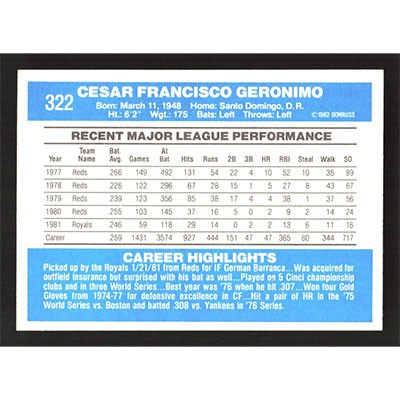 This is a 1982 Donruss Cesar Geronimo baseball card. The card is #322 and pictures show condition.