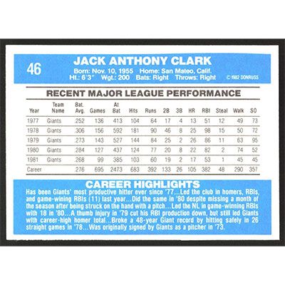 This is a 1982 Donruss Jack Clark baseball card. The card is #46 and pictures show condition.