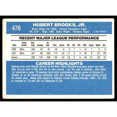 This is a 1982 Donruss Hubie Brooks baseball card. The card is #476 and pictures show condition.