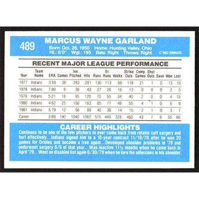 This is a 1982 Donruss Wayne Garland baseball card. The card is #489 and pictures show condition.