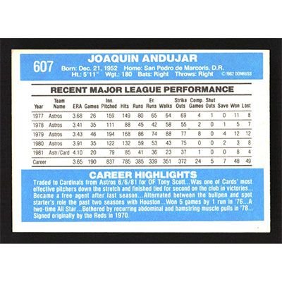 This is a 1982 Donruss Joaquin Andujar baseball card. The card is #607 and pictures show condition.