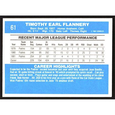This is a 1982 Donruss Tim Flannery baseball card. The card is #61 and pictures show condition.