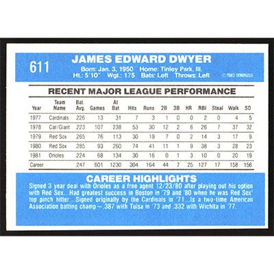 This is a 1982 Donruss Jim Dwyer baseball card. The card is #611 and pictures show condition.