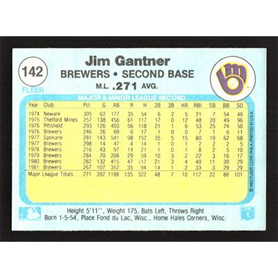 This is a 1982 Fleer Jim Gantner baseball card. The card is #142 and pictures show condition.