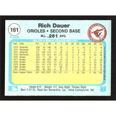 This is a 1982 Fleer Rich Dauer baseball card. The card is #161 and pictures show condition.
