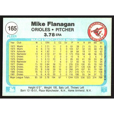 This is a 1982 Fleer Mike Flanagan baseball card. The card is #165 and pictures show condition.
