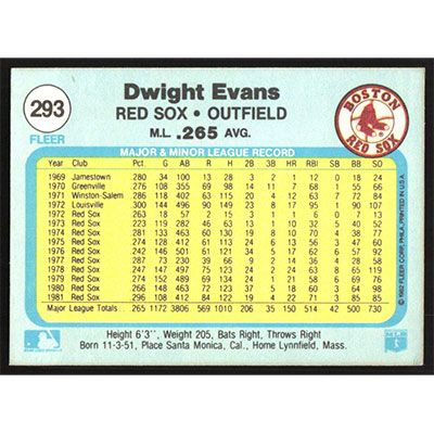 This is a 1982 Fleer Dwight Evans baseball card. The card is #293 and pictures show condition.