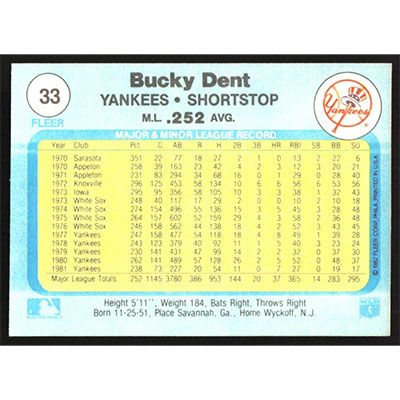 This is a 1982 Fleer Bucky Dent baseball card. The card is #33 and pictures show condition.