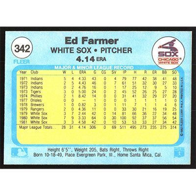 This is a 1982 Fleer Ed Farmer baseball card. The card is #342 and pictures show condition.