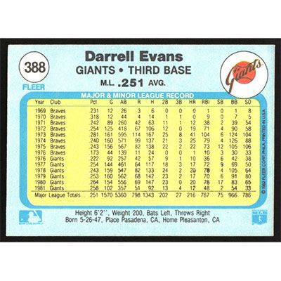 This is a 1982 Fleer Darrell Evans baseball card. The card is #388 and pictures show condition.