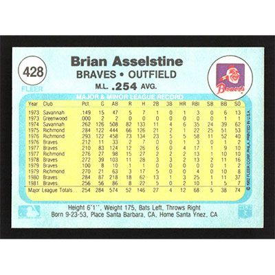 This is a 1982 Fleer Brian Asselstine baseball card. The card is #428 and pictures show condition.