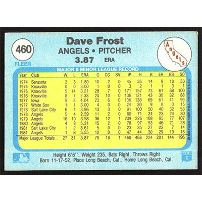 This is a 1982 Fleer Dave Frost baseball card. The card is #460 and pictures show condition.