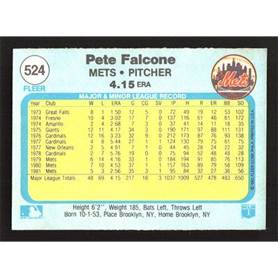 This is a 1982 Fleer Pete Falcone baseball card. The card is #524 and pictures show condition.