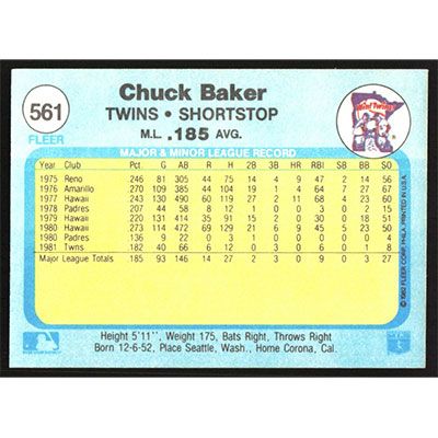 This is a 1982 Fleer Chuck Baker baseball card. The card is #561 and pictures show condition.