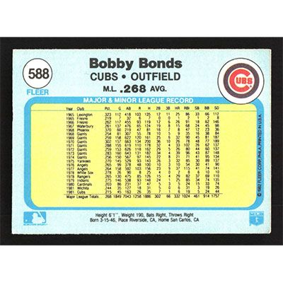 This is a 1982 Fleer Bobby Bonds baseball card. The card is #588 and pictures show condition.