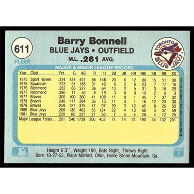 This is a 1982 Fleer Barry Bonnell baseball card. The card is #611 and pictures show condition.