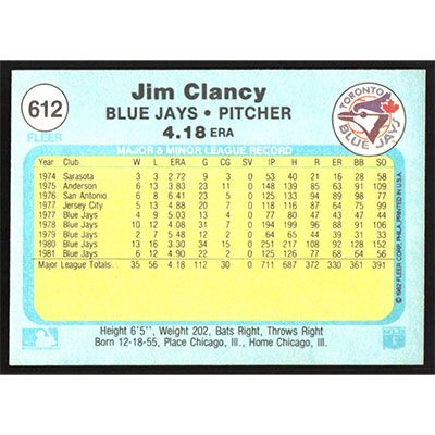 This is a 1982 Fleer Jim Clancy baseball card. The card is #612 and pictures show condition.