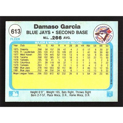 This is a 1982 Fleer Damaso Garcia baseball card. The card is #613 and pictures show condition.