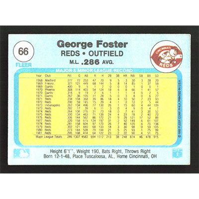 This is a 1982 Fleer George Foster baseball card. The card is #66 and pictures show condition.