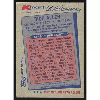 This is a 1982 K-Mart Rich Allen '72 AL MVP baseball card. The card is #21 and pictures show condition.