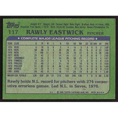 This is a 1982 Topps Rawly Eastwick baseball card. The card is #117 and pictures show condition.