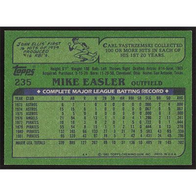 This is a 1982 Topps Mike Easler autographed baseball card. This card has been signed, in blue, by Mike Easler, and is guaranteed authentic by Ballcardz.com. The card is #235 and pictures show condition.