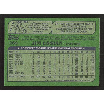 This is a 1982 Topps Jim Essian baseball card. The card is #269 and pictures show condition.