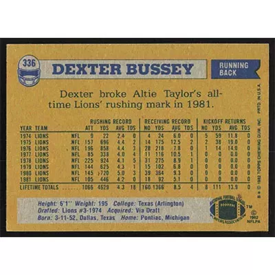 This is a 1982 Topps Dexter Bussey football card. The card is #336 and pictures show condition.