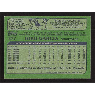 This is a 1982 Topps Kiko Garcia baseball card. The card is #377 and pictures show condition.
