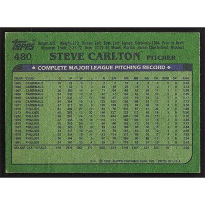 This is a 1982 Topps Steve Carlton baseball card. The card is #480 and pictures show condition.