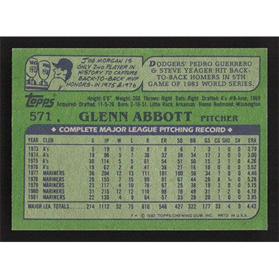 This is a 1982 Topps Glenn Abbott baseball card. The card is #571 and pictures show condition.